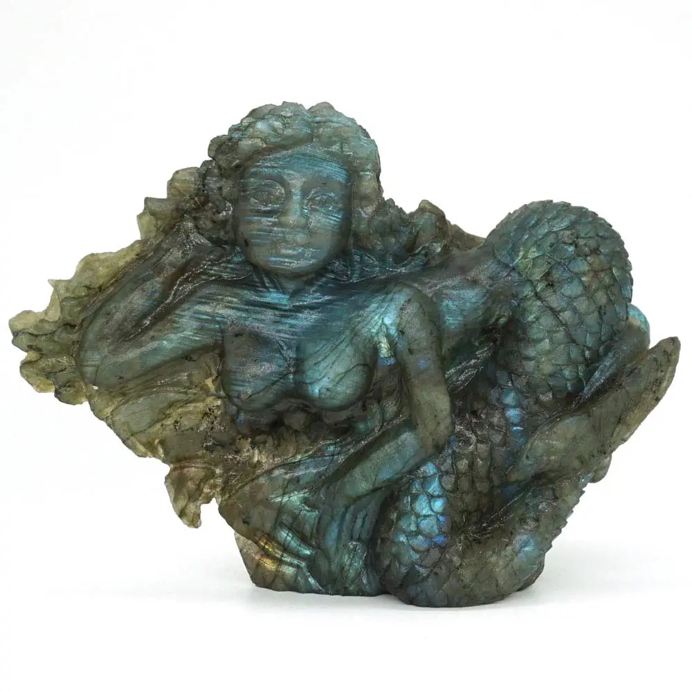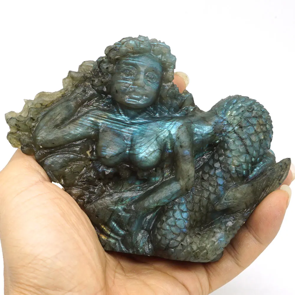 Best 5.15" Natural Gemstone Labradorite Stone Mermaid Figurine Carved Crystal Healing Reiki Carved Statu