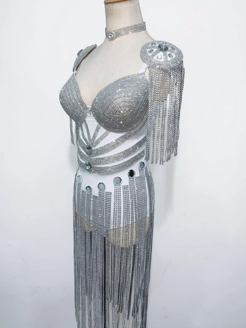 HIGH QUALITY New Silver Sparkly Rhinestones Fringe Leotard Sexy Stage Dance Bodysuit White Nightclub Party Perfo