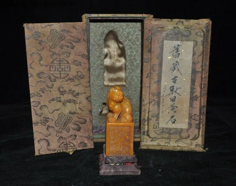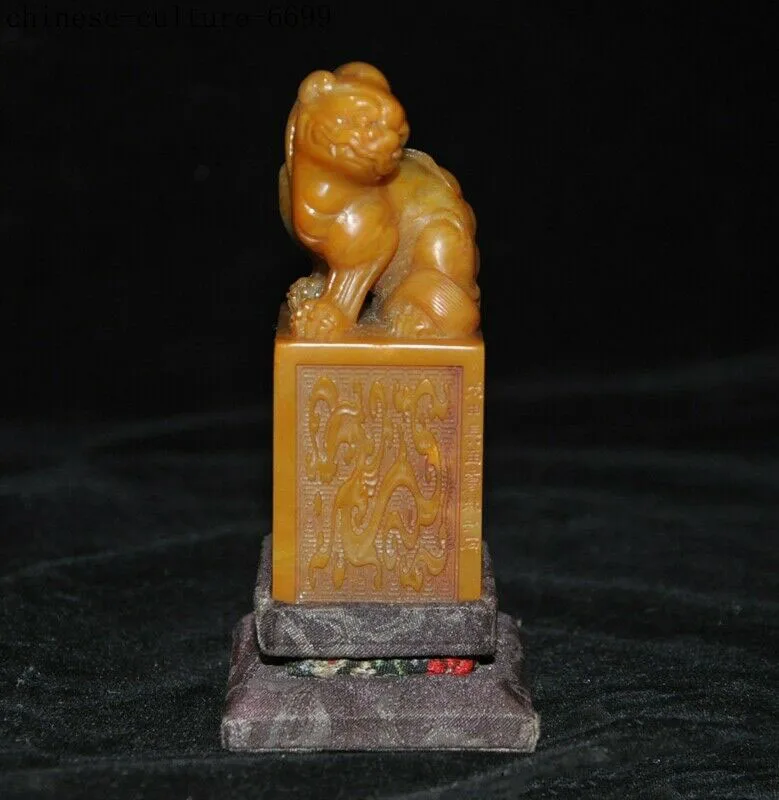 ORIGINAL wedding decoration Natural Tianhuang Shoushan Stone Pixiu beast Text Seal stamp signet wood Box set