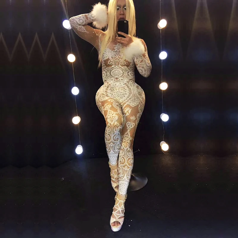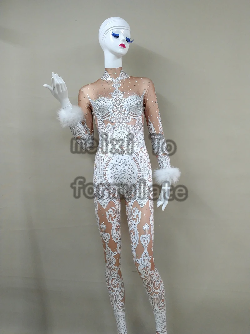 Sexy White Lace Rhinestones Bodysuit Female Singer Stage Jumpsuit Costume Party Celebrate Glisten S