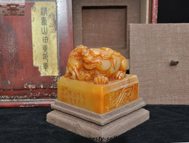 Review Top Natural Tianhuang Shoushan Stone Pixiu beast Text Seal stamp signet wood Box set
